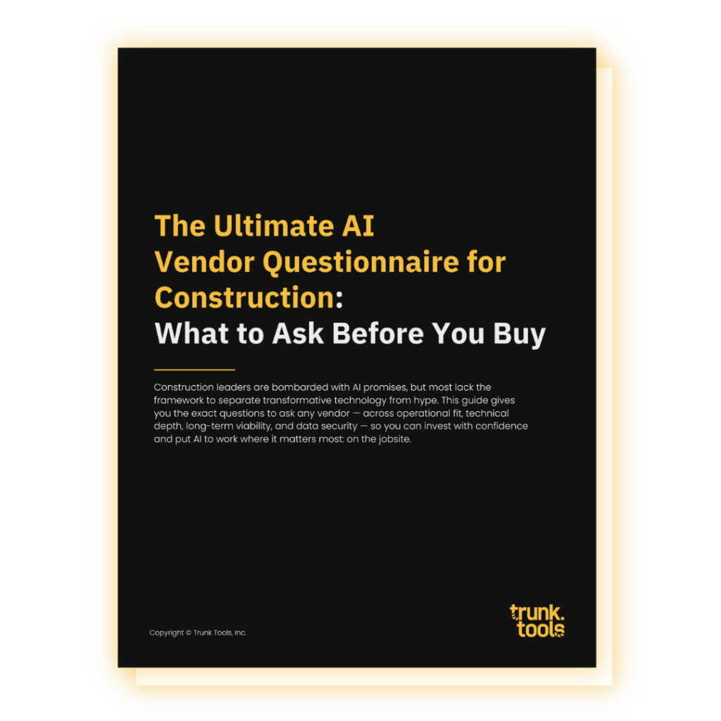 Construction leaders are bombarded with AI promises, but many lack the framework to separate transformative technology from hype. This guide gives you the exact questions to ask any vendor — across operational fit, technical depth, long-term viability, and data security — so you can invest with confidence and put AI to work where it matters most: on the jobsite.